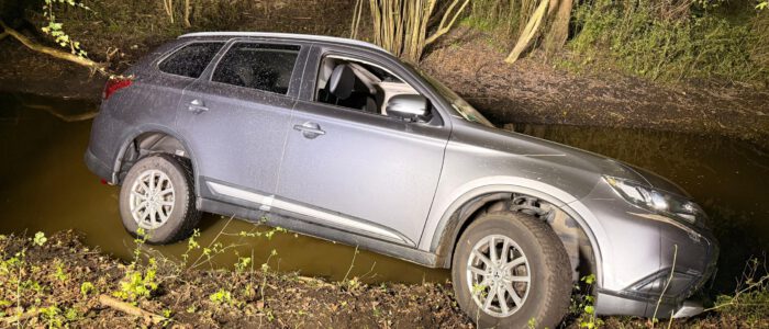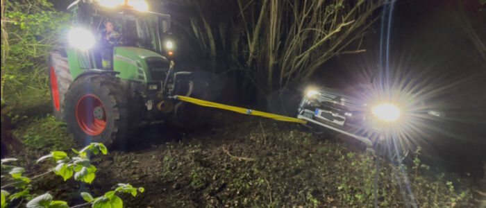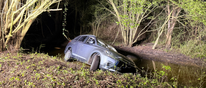 Zu einem außergewöhnlichen Einsatz wurde die Freiwillige Feuerwehr Malsch am Freitagabend, den 10. April 2026, um 21.43 Uhr durch die Leitstelle Rhein-Neckar zu einer Hilfeleistung mit der Alarmmeldung „Amtshilfe Polizei“ alarmiert. Zuvor wurden die Führungskräfte der Feuerwehr Malsch um 21.16 Uhr verständigt und rückten mit dem Mannschaftstransportwagen (MTW) zur ersten Erkundung aus. Vor Ort waren schon mehrere Polizeibeamte und wiesen die Feuerwehr ein. Ein Autofahrer aus dem Landkreis Karlsruhe hatte aus bislang ungeklärter Ursache die Bundesstraße B3 vor der Sperrung auf Höhe der Firma Wienerberger verlassen und war über einen Arbeits- sowie anschließenden Waldweg weitergefahren. Dabei geriet das Fahrzeug auf einen zunehmend schmaler werdenden Pfad. Beim Versuch zu wenden, rutschte der Wagen in einen Bachlauf und wurde teilweise mit Wasser geflutet. Ein zufällig vorbeikommender Förster entdeckte das Fahrzeug und verständigte umgehend die Rettungskräfte. Mehrere Streifen der Polizei trafen als erste am Einsatzort ein, mussten jedoch die letzten rund 200 Meter zu Fuß zurücklegen und befreiten den Fahrer aus seinem Fahrzeug. Die dann nachalarmierte Feuerwehr Malsch leuchtete die Einsatzstelle aus und bereitete dann die Bergung des Fahrzeuges vor. Nachdem der Waldweg mithilfe von Motorsägen teilweise freigeschnitten worden war, konnte ein ebenfalls hinzugezogener Traktor das Fahrzeug aus dem Bach ziehen. Anschließend gelang es, den Wagen aus eigener Kraft zurück zur B3 zu bringen, wo er der Polizei übergeben wurde. Der Fahrer war zu diesem Zeitpunkt bereits von Angehörigen abgeholt worden. Der Einsatz dauerte rund zwei Stunden. Die Feuerwehr Malsch war mit neun Einsatzkräften und zwei Fahrzeugen vor Ort, unterstützt von mehreren Polizeistreifen. Abschließend sperrte die Straßenmeisterei die Zufahrt zu dem betroffenen Waldweg, um künftig ähnliche Vorfälle zu verhindern. Nach Ende des Einsatzes konnte die Feuerwehr Malsch wieder ins Feuerwehrgerätehaus einrücken und sich bei der Leitstelle einsatzbereit melden.